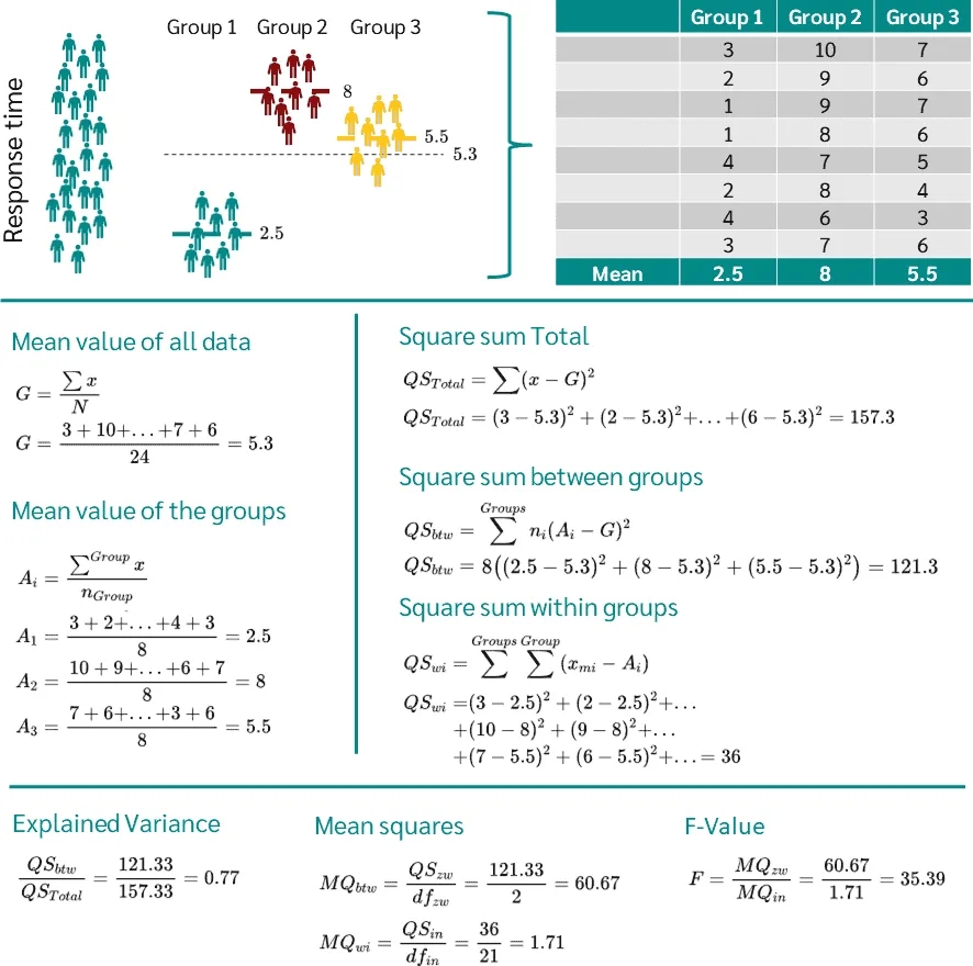 方差分析 (ANOVA) 用于检验是否在两个以上的样本之间存在统计显著性差异。为此,将各组的均值和方差相互比较。与 t 检验不同,t 检验用于检验两个样本之间是否存在差异,而 ANOVA 用于检验两个以上的组之间是否存在差异。
