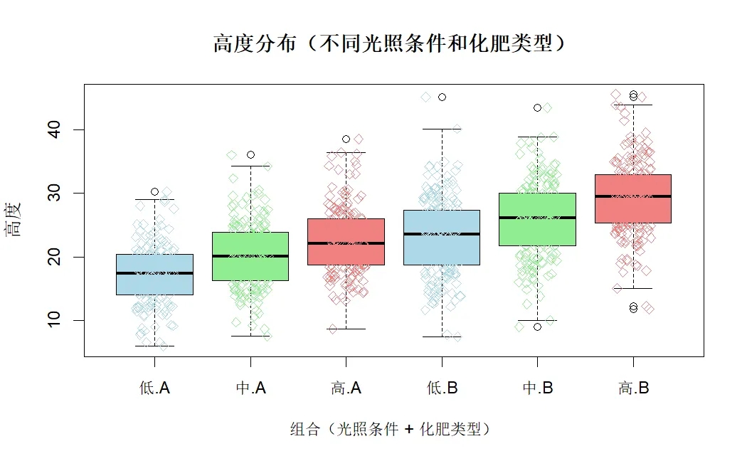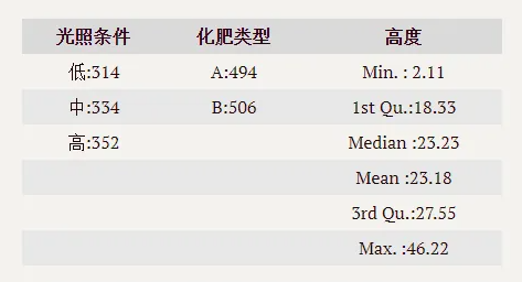 - 研究背景:假设我们想研究两种不同的肥料类型(有机肥料A和化学肥料B)以及三种不同的光照条件(低光照、中等光照和高光照)对一种特定植物(如小麦)生长的影响。研究的主要目标是确定肥料类型和光照条件对植物生长的综合效果,以及它们之间是否存在交互作用。