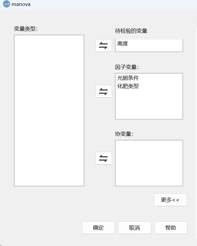 d.lsmeans:本次研究中还需考察“光照条件”与“化肥类型”的交互作用,因此免不了要考察当固定某个因素在一个水平时,另外一个因素各水平均值之间是否存在显著差异,因此我们在lsmeans中将交互因素选入右侧“待分析变量”,勾选“多重比较”选择框。