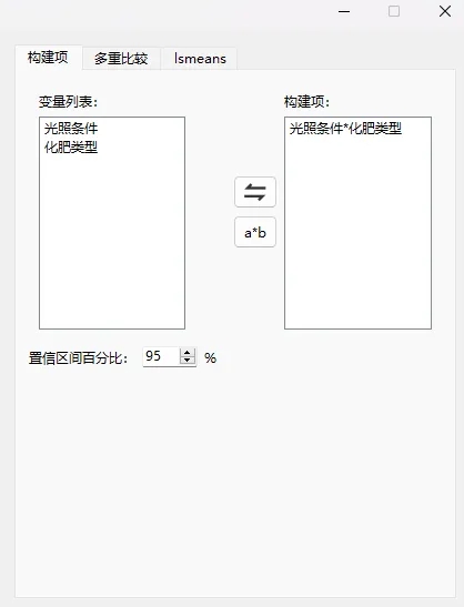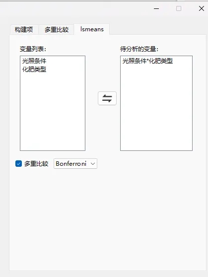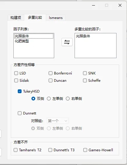b.多重比较因子:选择 “光照条件”和“化肥类型” 。