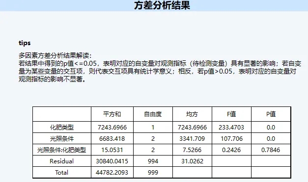 根据分析结果,不同的“化肥类型”会显著影响植物生长高度,而化肥类型只有A和B两种,因此不难推断出两种化肥类型的作用效果对植物的生长的影响具有显著差异。而“光照条件”却含有三个分类,因此具体是哪两种分类具有显著影响,而哪两种不显著,则要进一步查阅多种比较的分析结果。