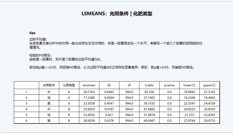 从方差表中可以看到,关于化肥类型和光照条件计算的均方和F值,以及最关键的p值。结果显示,该数据的p值远小于0,表明差异极为显著。然而两者的交互作用检验得到的p值=0.7846(p值>0.05)表明二者不存在交互作用。因此无需解读lsmeans计算得到的分析结果。
