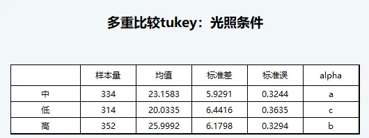 从DMSAS中输出的多重比较结果来看,光照条件的各组因素均存在显著差异。