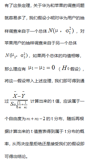 通俗一些解释:当小明同学进行了一轮问卷试验时,相当于他在一个总体中(全国手机用户)进行了一次抽样调查,假如小明同学继续任劳任怨的进行第二轮、第三轮、第四轮....第m轮的问卷调查,当m趋向于无穷大,且在总体方差已知的情况下,m轮调查下来的问卷平均得分(这里我们先不管是苹果手机还是华为手机),将服从一个正态分布。但若将总体方差未知,用样本方差替换,将服从一个自由度为每次调查样本量-1的t分布。