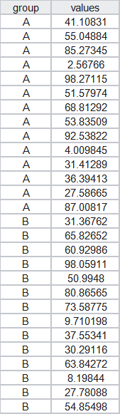 其中"RData.csv"的数据如下所示,所示数据是A类土壤和B类土壤中速效氮含量的测定数据: