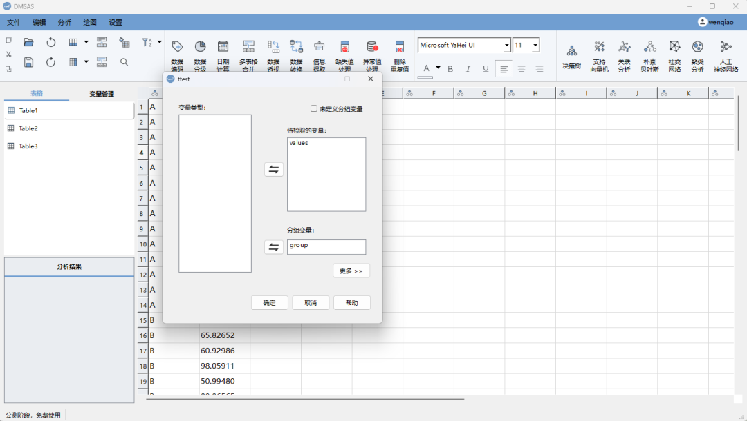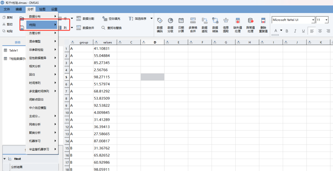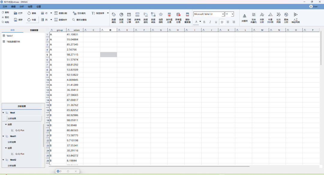 上述对t分布和t检验做了详细解析,也融合了生动的案例学习,相信大家对t检验的检验步骤有了清晰的了解,感兴趣的朋友可以用上面附录中关于独立样本t检验的R语言代码来尝试做一下分析,但我们日常分析需求中也不用这么复杂,下面我给大家用我们第一款国产化科研级数据分析软件"DMSAS"来做一下独立样本t检验分析,数据案例就用上述"RData.csv"的数据来演示: