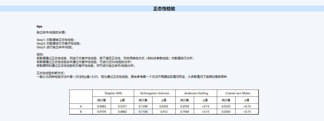 从结果上我们可以看到除了输出分析结果,软件还给出了独立样本t检验的步骤及规则、正态性检验判断方式和方差齐性判断方式,这对于初学者和新手非常友好,可以一站式解决我们的统计分析需求。