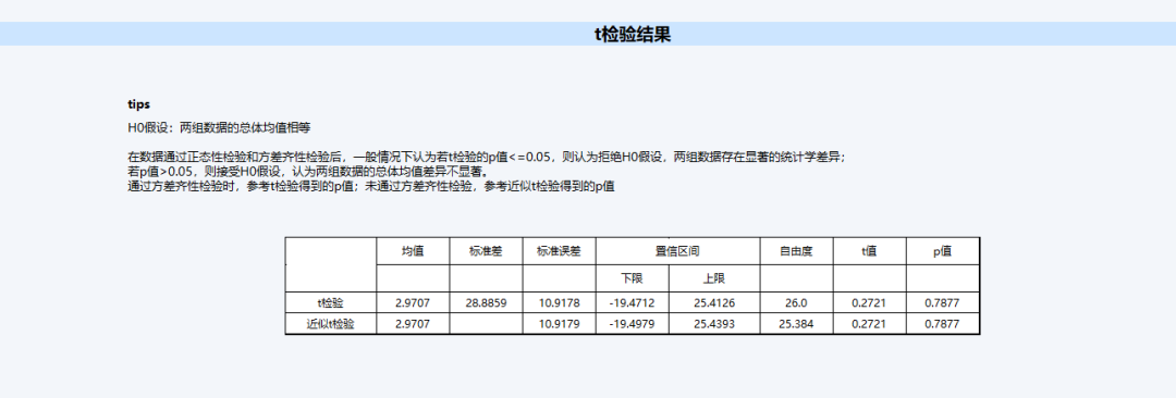 3. 下面软件直接输出分析结果,包含了t检验的所有步骤和结果说明