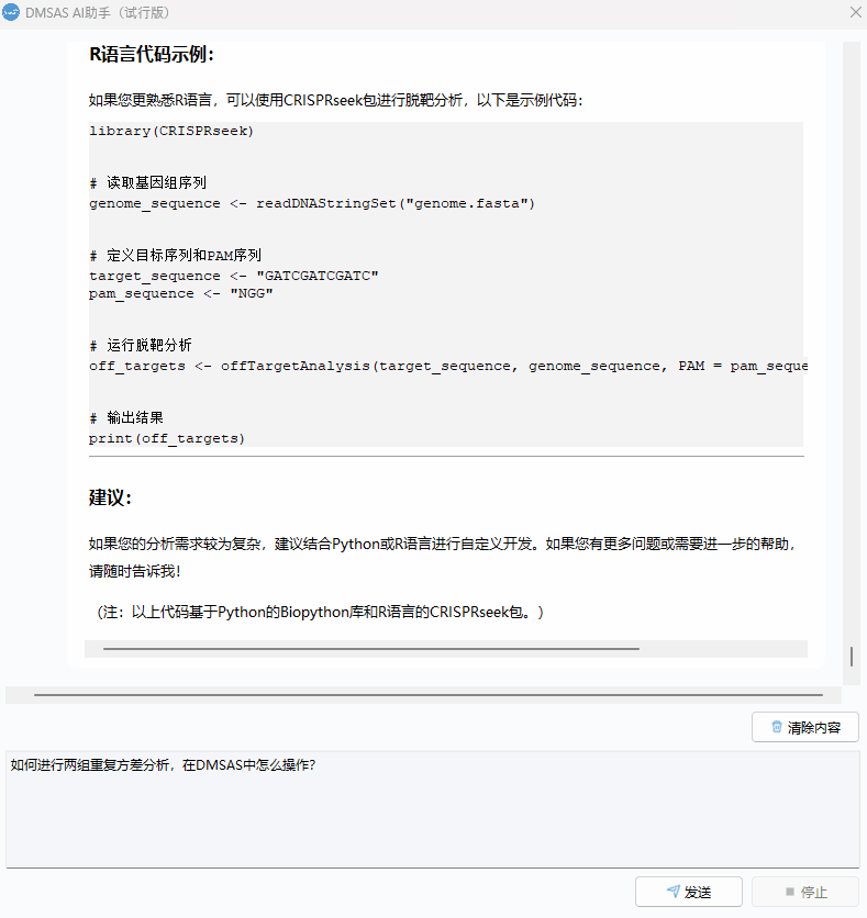 输入“如何用DMSAS实现CRISPR-Cas9脱靶率分析?”